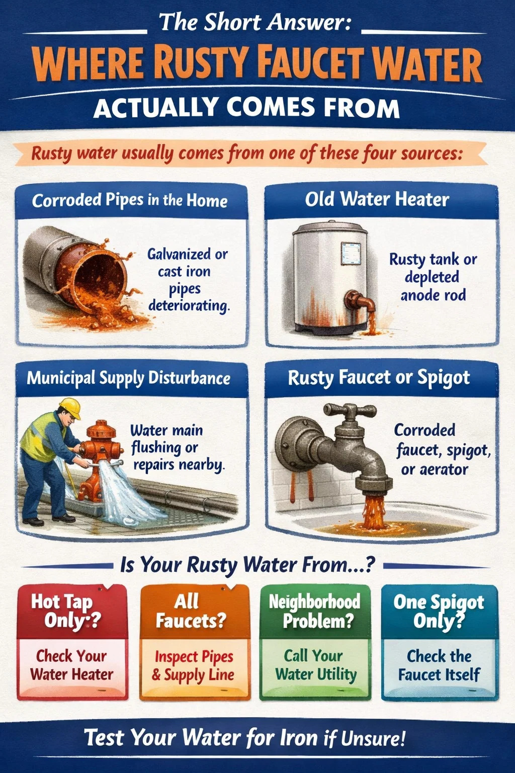 蛇口から出る錆びた水は、ほとんどの場合、次の 4 つの原因のいずれかが原因で発生します。それは、家の中の腐食した鉄または鋼管、給湯器の劣化、自治体の供給ラインの土砂の乱れ、または配達時の蛇口や備品の酸化です。目に見えるオレンジ色、茶色、または赤みがかった色合いは、パイプの内部から剥がれ落ちて水流に入ったか、老朽化したインフラを通過するときに水中に直接溶解した酸化鉄、つまり錆です。